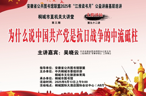 “文都讲坛”公益讲座是一项由桐城市文广新局主办、桐城市图书馆承办的公共文化服务项目,于2011年3月24日正式揭牌开讲。“文都讲坛”以“承继文脉、传播知识、启迪民智、服务社会”为宗旨,聘请专家学者讲授各类知识,内容涵盖读书学习、社会热点、百姓生活、桐城文化等等方面,以满足广大人民群众日益增长的文化生活需求,弘扬民族传统文化和社会主义先进文化,提升市民素质,增强城市文化软实力,促进桐城文化的繁荣和发展。我们热忱期待社会各界的更多关注与支持,与我们一起打造更完美的“文都讲坛”。