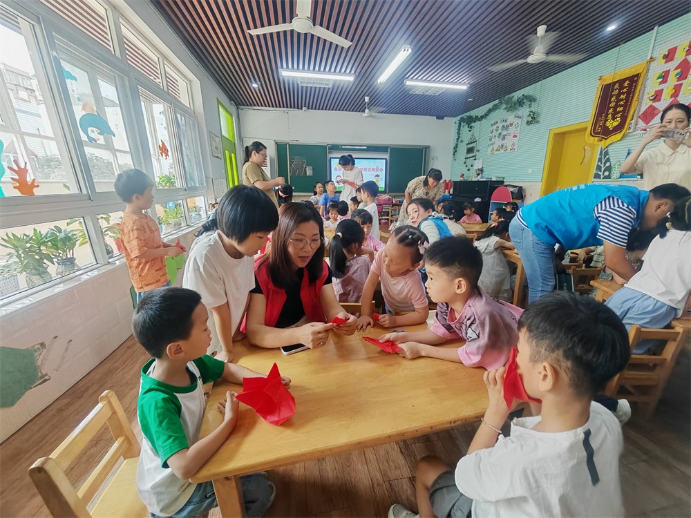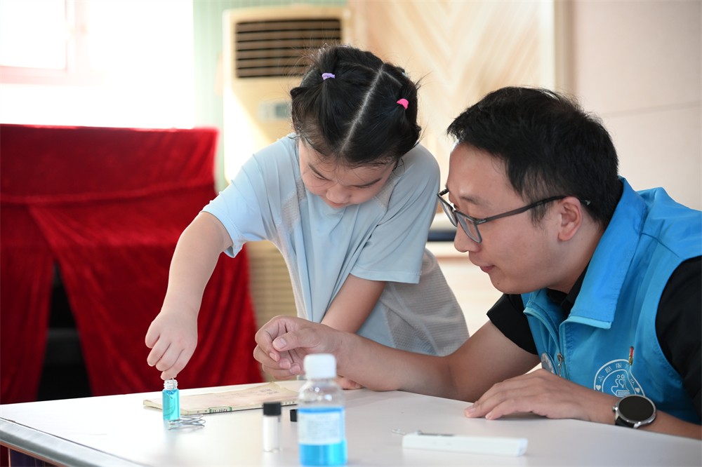 现场首先播放了由志愿者自编自导自演的少儿阅读体验中心使用指南Vlog,以轻松活泼的视频语言打破传统图书馆的刻板印象,生动展现现代化服务理念。随后开展的“神奇的水变铜”科普小实验将气氛推向高潮,孩子们在互动中感受科学魅力,萌发探索未知的兴趣。志愿者还将“奇观·昆虫秘语”科学艺术展带到现场,通过昆虫标本与古生物化石,引领孩子走进奇妙的微观世界。教室内,结合中国人民抗日战争暨世界反法西斯战争胜利80周年,特邀省馆退役军人为孩子讲解军事绘本、制作纸质战机模型,并通过“一个也不能少”中国地图拼图互动,在寓教于乐中厚植爱国主义情怀。