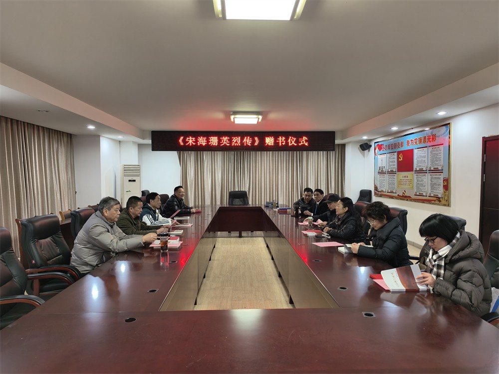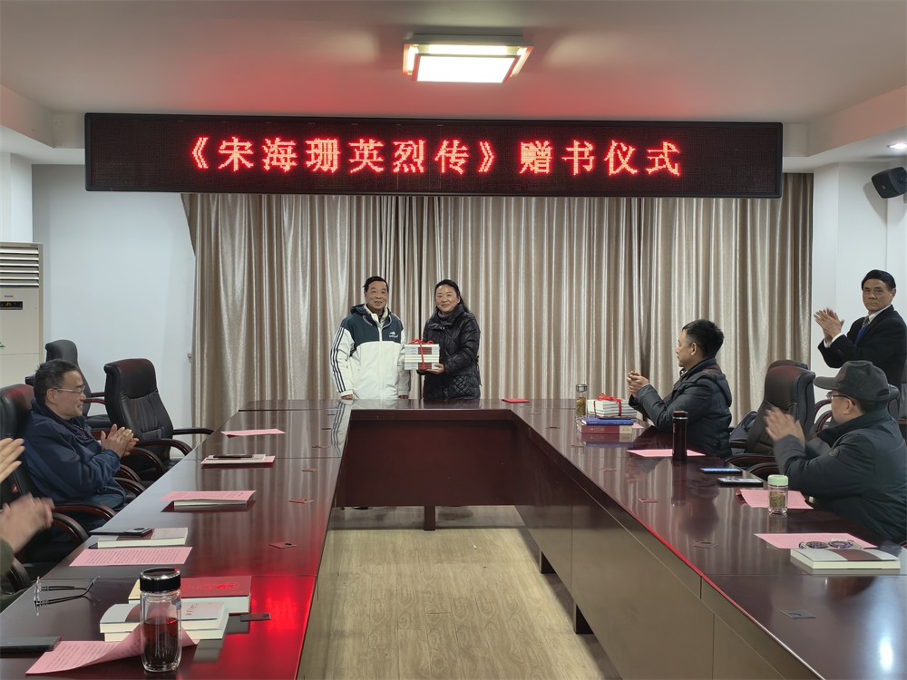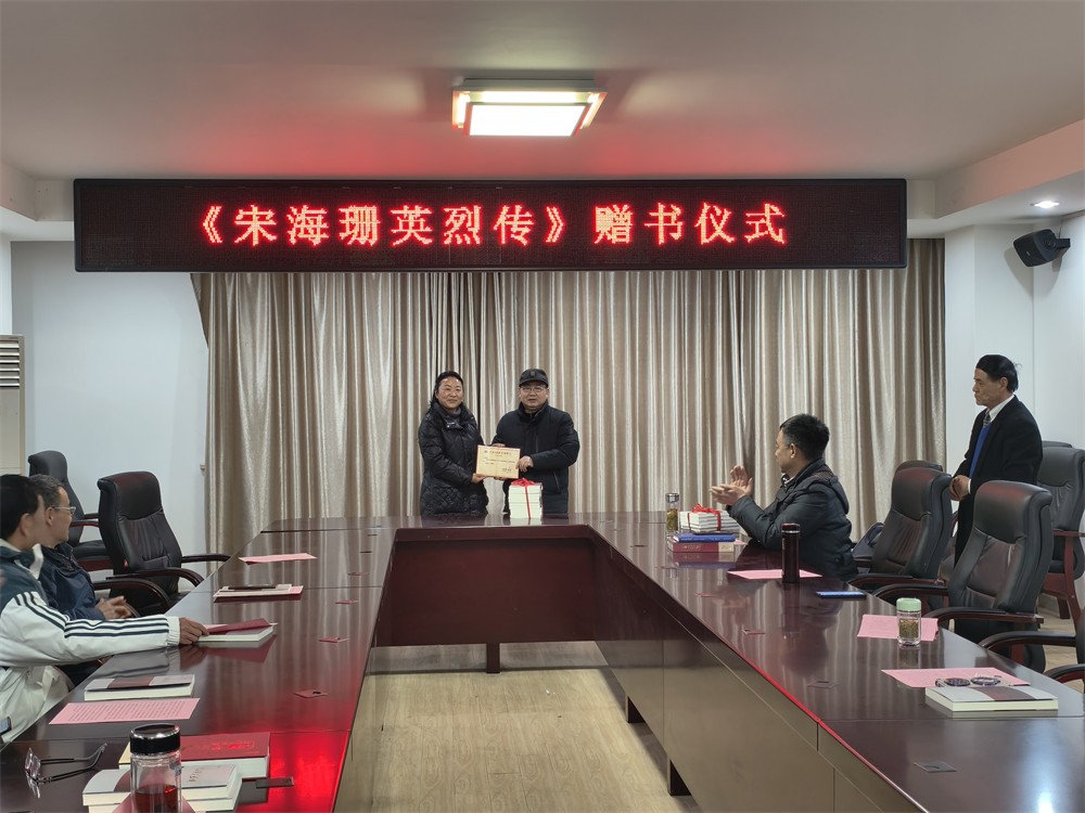 1月27日下午,《宋海珊英烈传》赠书仪式在桐城市老年大学二楼会议室开展。中国诗词研究会会员、安徽省诗词协会会员、桐城市新四军历史研究会会员方长国向桐城市图书馆捐赠《宋海珊英烈传》20册。桐城市图书馆馆长吴苏琴接受捐赠并表示感谢,同时向捐赠人颁发收藏证书。