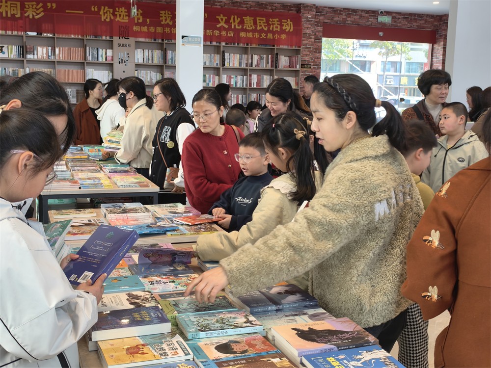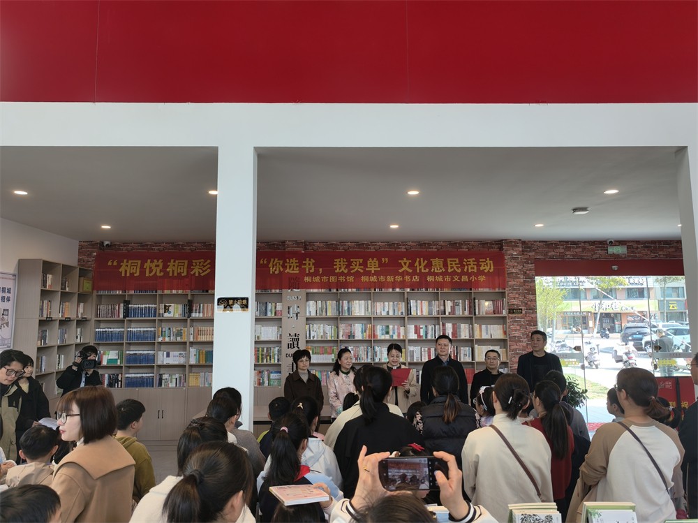 2026年2月1日起,《全民阅读促进条例》正式施行。为充分发挥公共图书馆阅读推广主阵地作用,满足广大读者多元化、个性化的阅读需求,精准提升图书馆馆藏资源的服务效能,推动全民阅读,落实文化惠民,助力书香桐城建设,3月29日上午,桐城市图书馆主办、桐城市新华书店、桐城市文昌小学协办的2026年桐城市全民阅读系列活动“桐悦桐彩”——“你选书,我买单”文化惠民活动在桐城市新华书店开展。市文旅体局党组成员项并玉,文昌小学党支部书记、校长段金生,文昌小学督学刘平海,新华书店副经理叶首忠,桐城市图书馆馆长吴苏琴等参加活动。