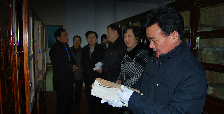 黄杰副市长小心翼翼地翻阅我馆古籍部珍贵古籍存书