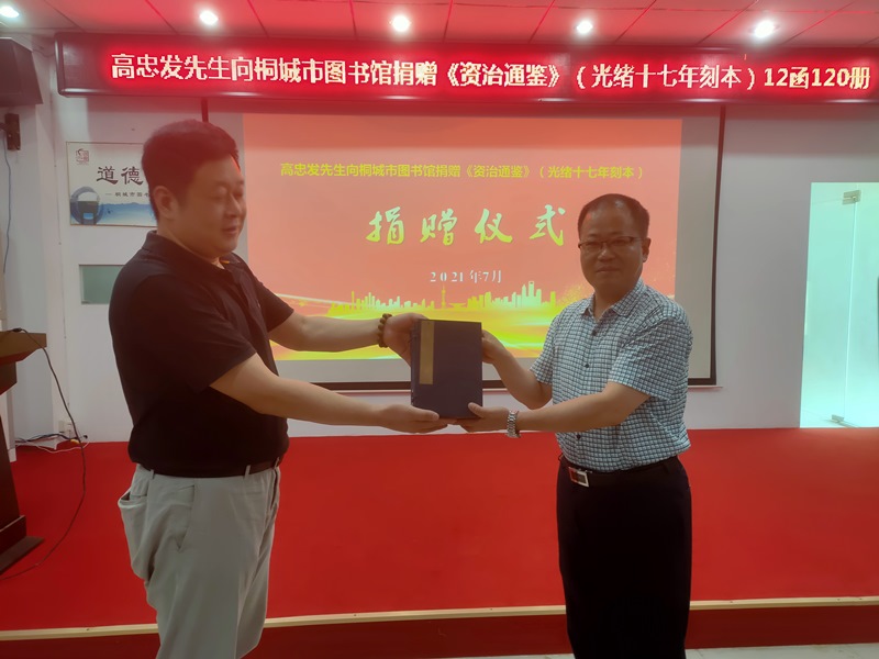 7月20上午,桐城乡贤高忠发先生向桐城市图书馆捐赠《资治通鉴》(光绪十七年刻本)捐赠仪式在市图书馆三楼多功能厅举行。